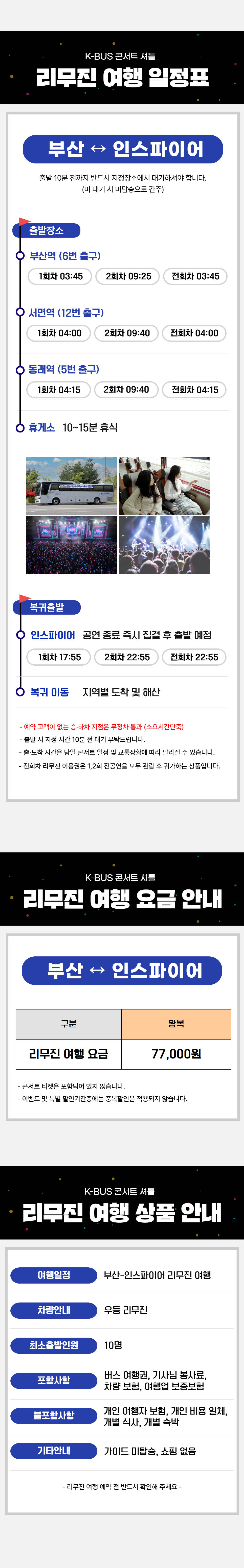 | ·불포함내역 | 팬미팅입장권, 개인 여행자 보험, 개인 비용 일체 개별 식사, 개별 숙박, 가이드 미탑승, 쇼핑없음 |
