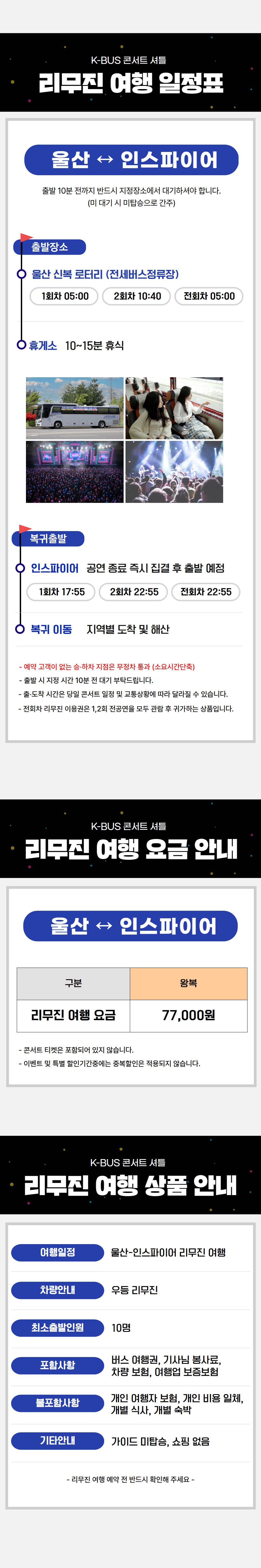 | ·불포함내역 | 콘서트입장권, 개인 여행자 보험, 개인 비용 일체 개별 식사, 개별 숙박, 가이드 미탑승, 쇼핑없음 |