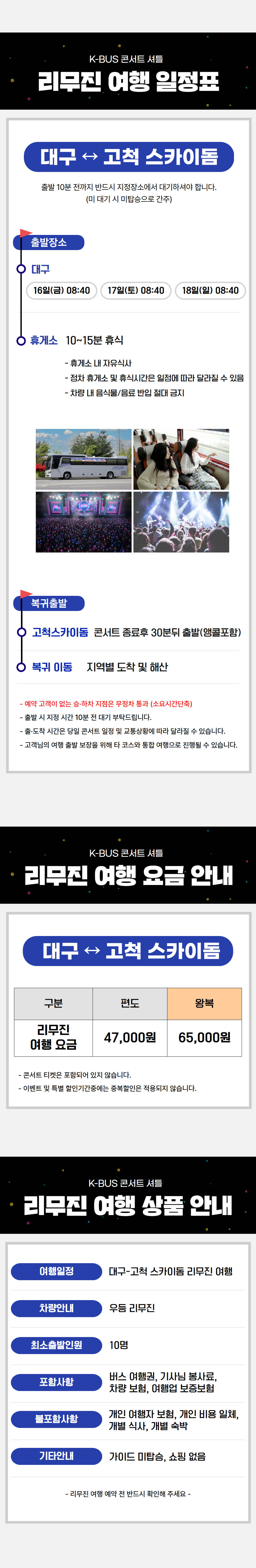 | ·불포함내역 | 콘서트입장권, 개인 여행자 보험, 개인 비용 일체 개별 식사, 개별 숙박, 가이드 미탑승, 쇼핑없음 |