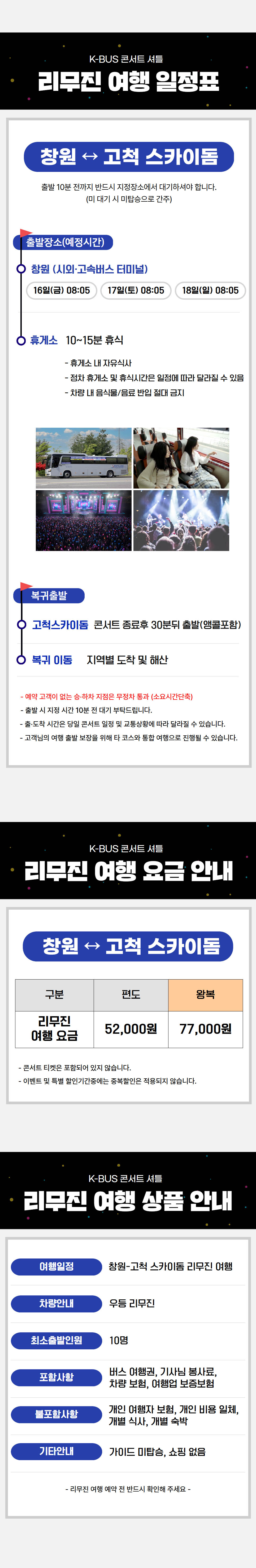 | ·불포함내역 | 콘서트입장권, 개인 여행자 보험, 개인 비용 일체 개별 식사, 개별 숙박, 가이드 미탑승, 쇼핑없음 |