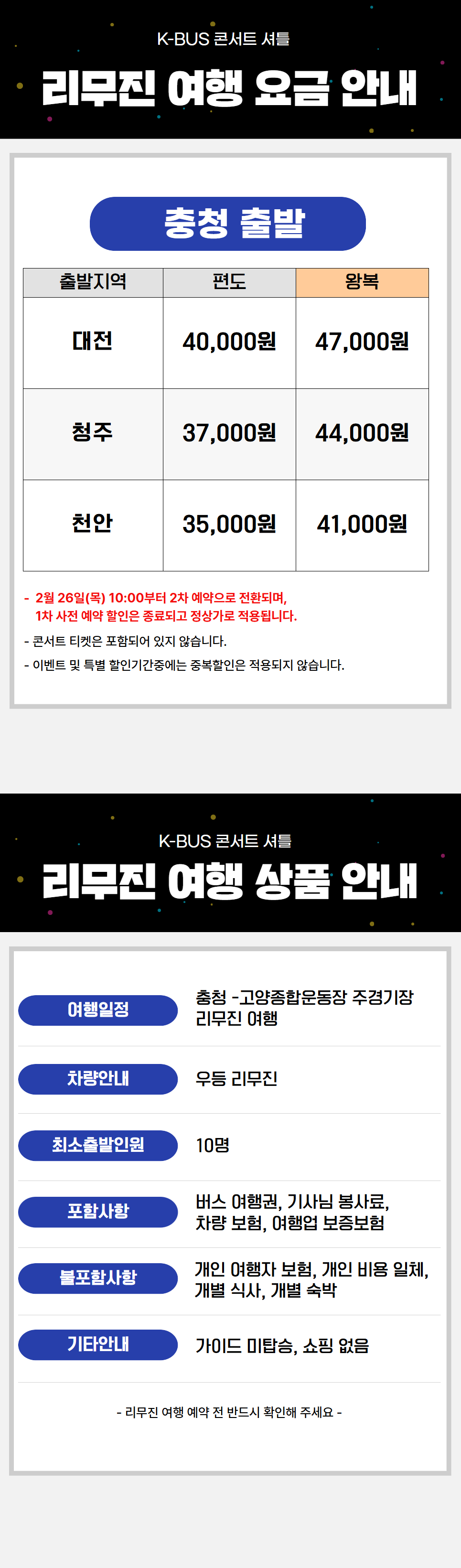 | ·불포함내역 | 콘서트 입장권, 개인 여행자 보험, 개인 비용 일체, 개별 식사, 개별 숙박, 가이드 미탑승, 쇼핑없음 |