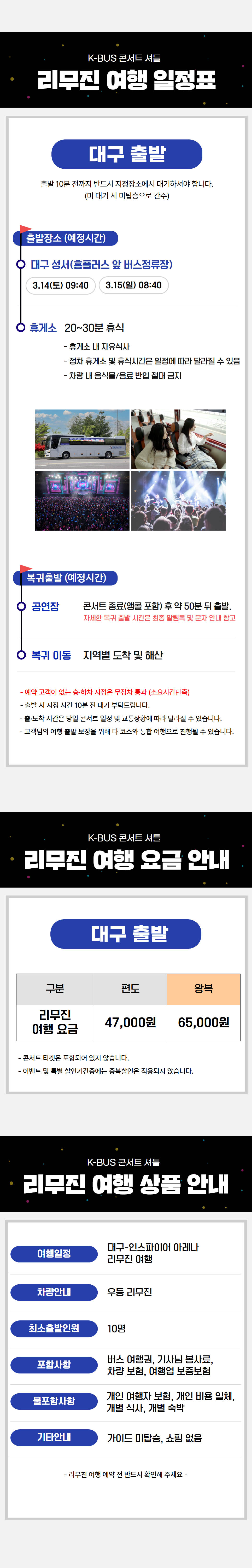 | ·불포함내역 | 콘서트 입장권, 개인 여행자 보험, 개인 비용 일체 개별 식사, 개별 숙박, 가이드 미탑승, 쇼핑없음 |