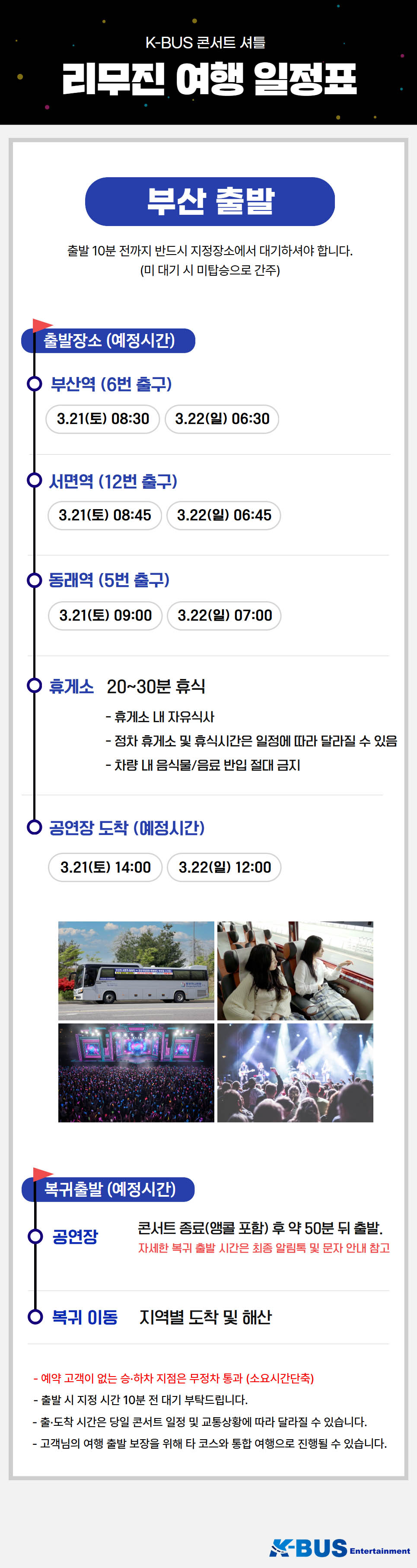 | ·불포함내역 | 콘서트 입장권, 개인 여행자 보험, 개인 비용 일체, 개별 식사, 개별 숙박, 가이드 미탑승, 쇼핑없음 |