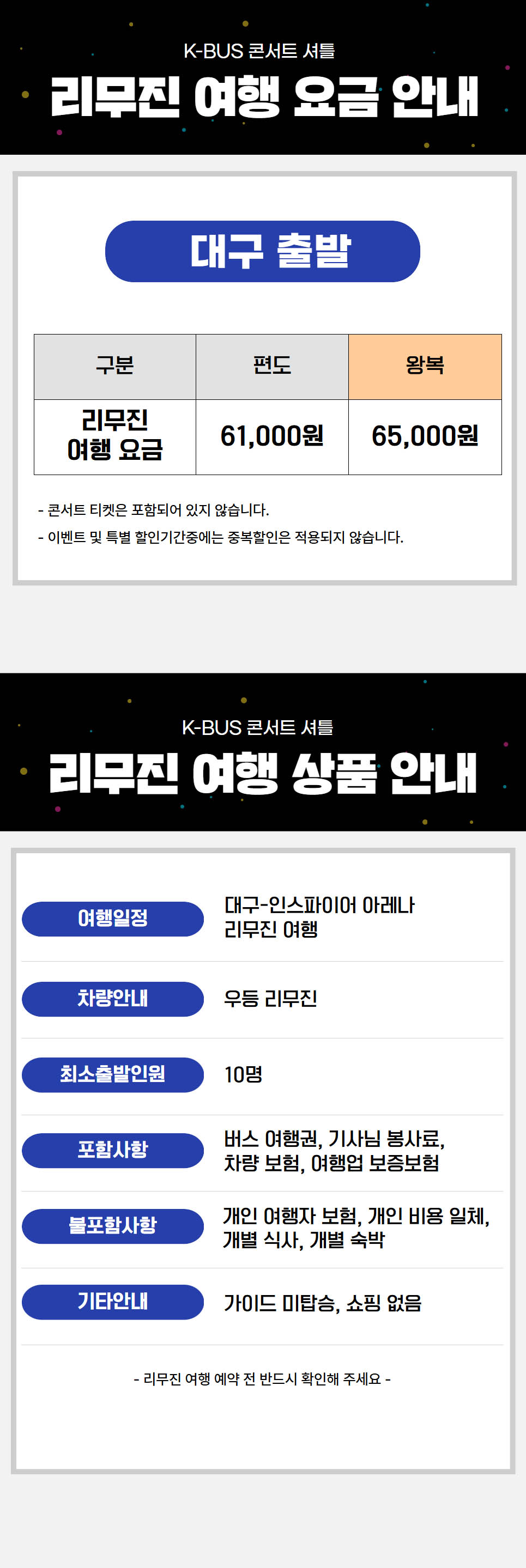 | ·불포함내역 | 콘서트 입장권, 개인 여행자 보험, 개인 비용 일체, 개별 식사, 개별 숙박, 가이드 미탑승, 쇼핑없음 |
