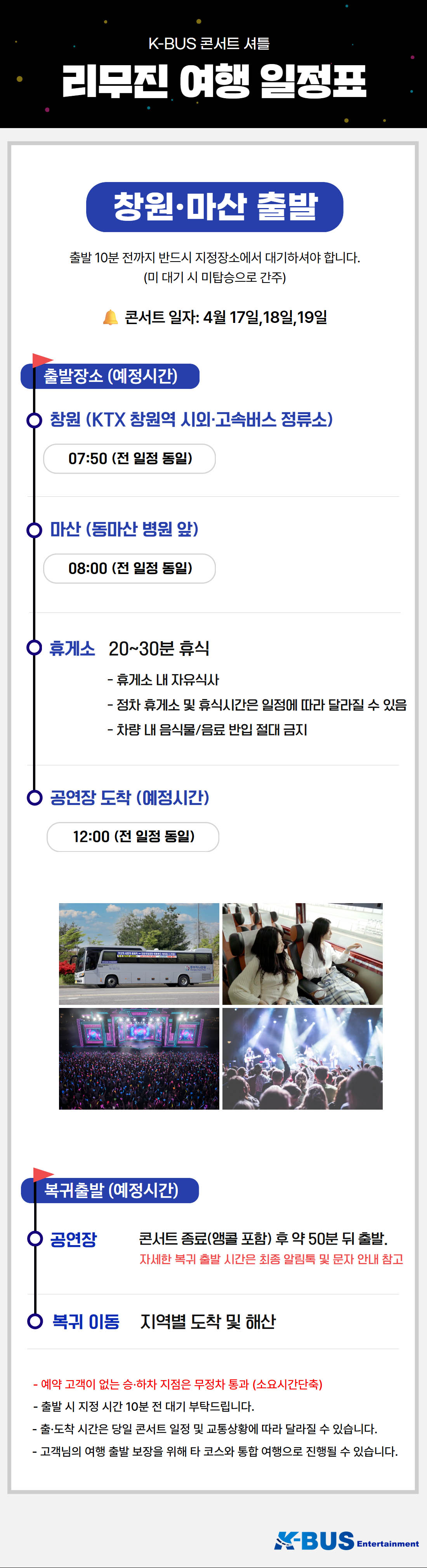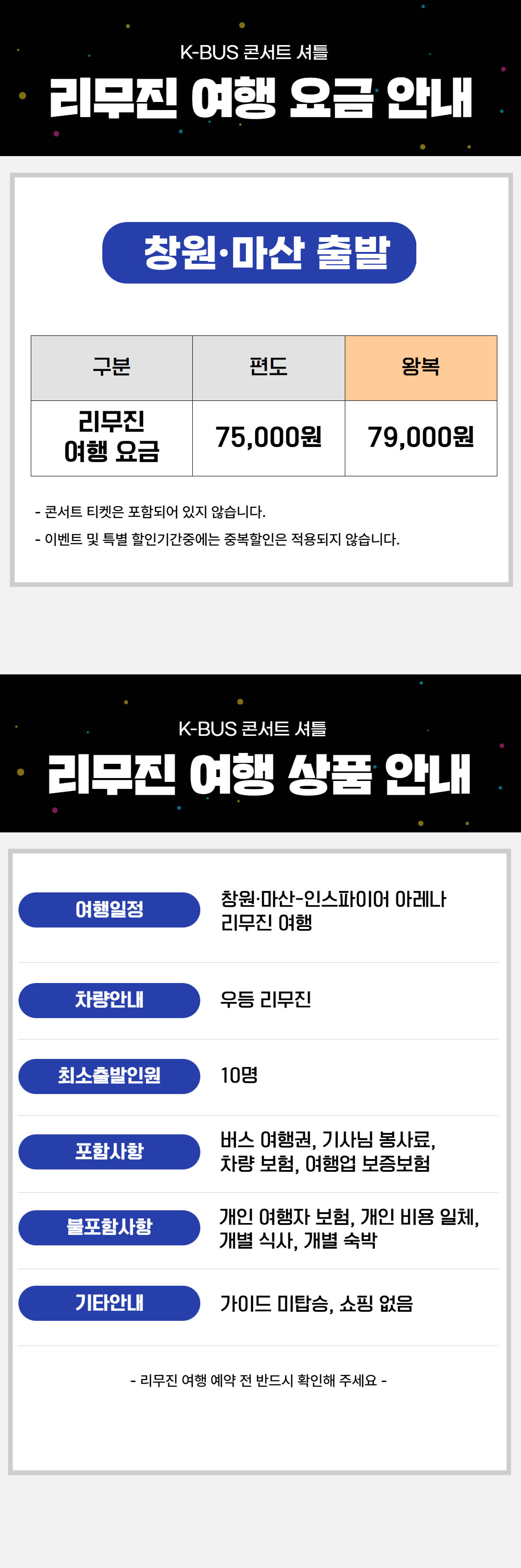 | ·불포함내역 | 콘서트 입장권, 개인 여행자 보험, 개인 비용 일체, 개별 식사, 개별 숙박, 가이드 미탑승, 쇼핑없음 |
