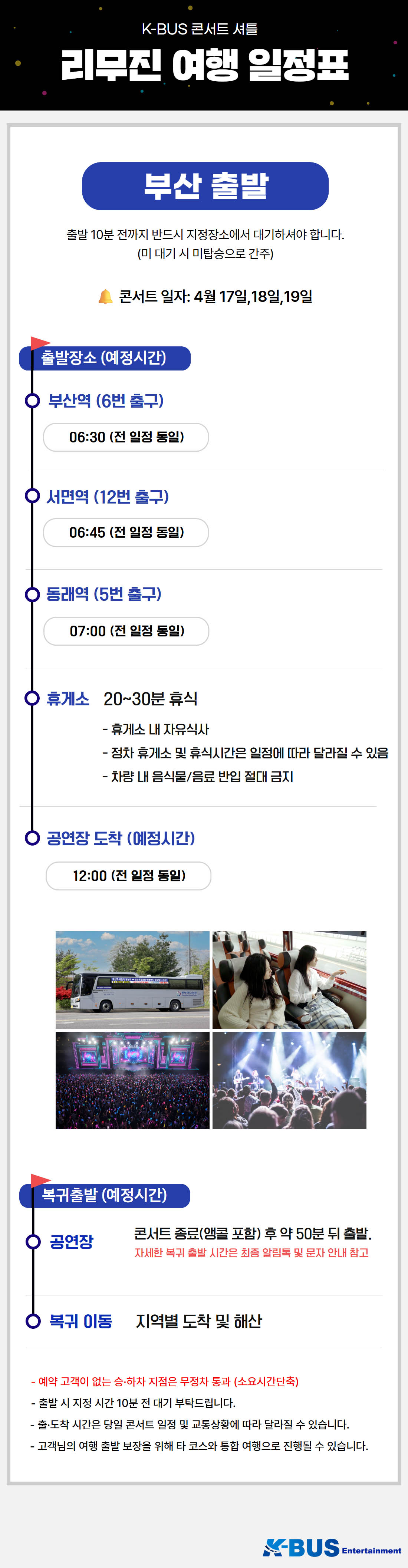| ·불포함내역 | 콘서트 입장권, 개인 여행자 보험, 개인 비용 일체, 개별 식사, 개별 숙박, 가이드 미탑승, 쇼핑없음 |