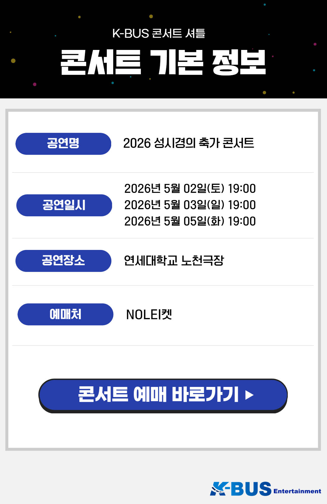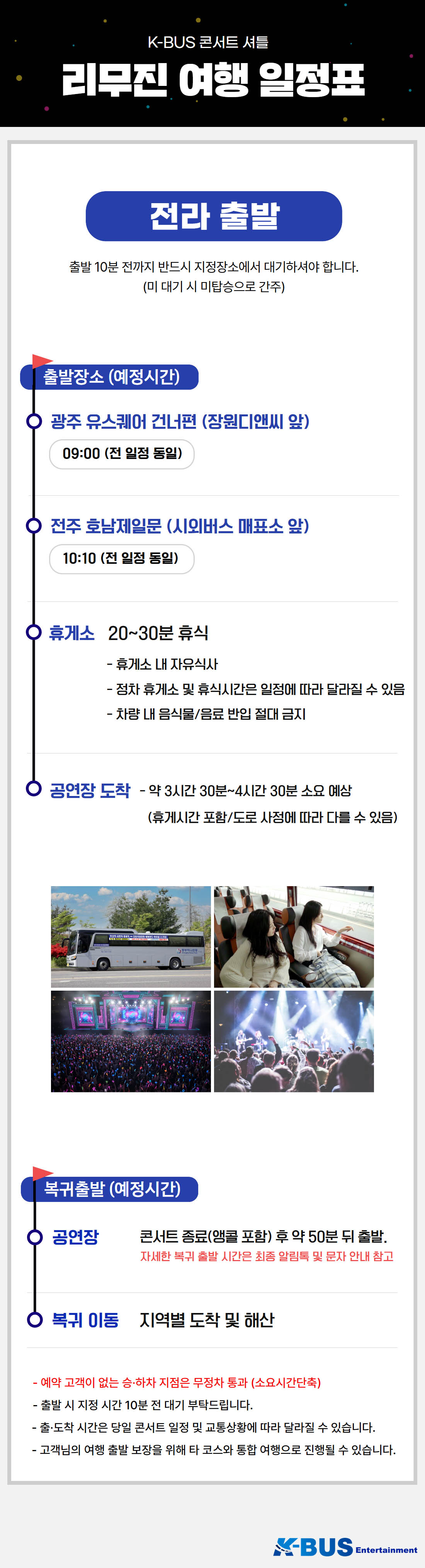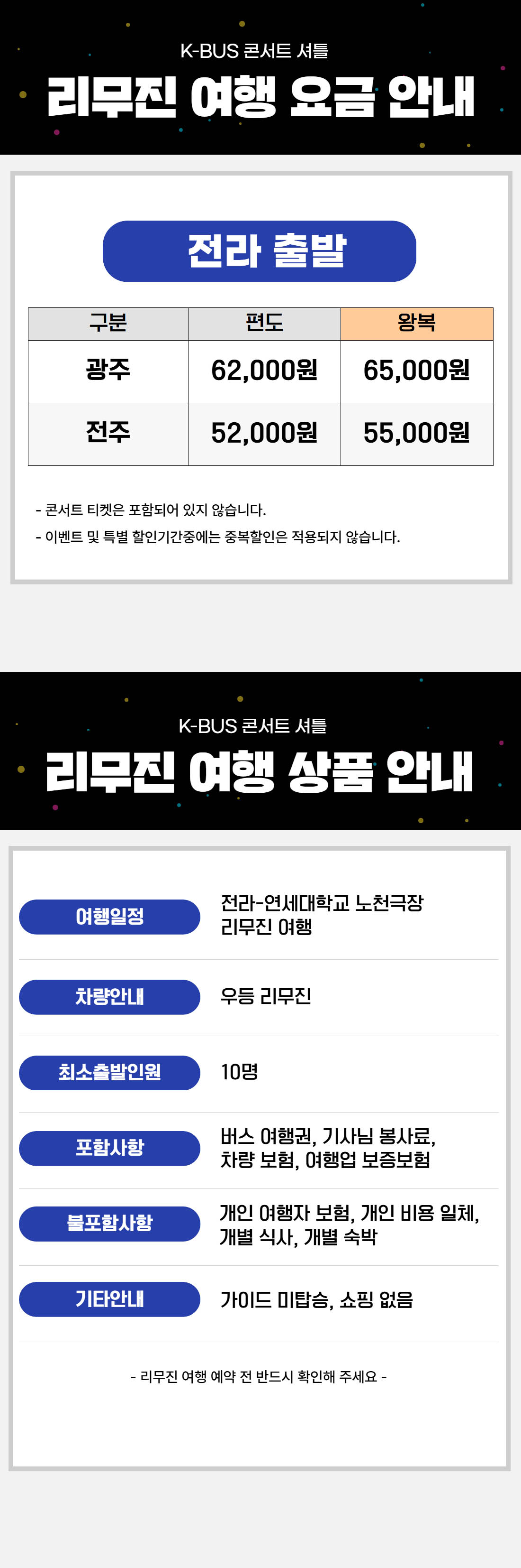| ·불포함내역 | 콘서트 입장권, 개인 여행자 보험, 개인 비용 일체, 개별 식사, 개별 숙박, 가이드 미탑승, 쇼핑없음 |