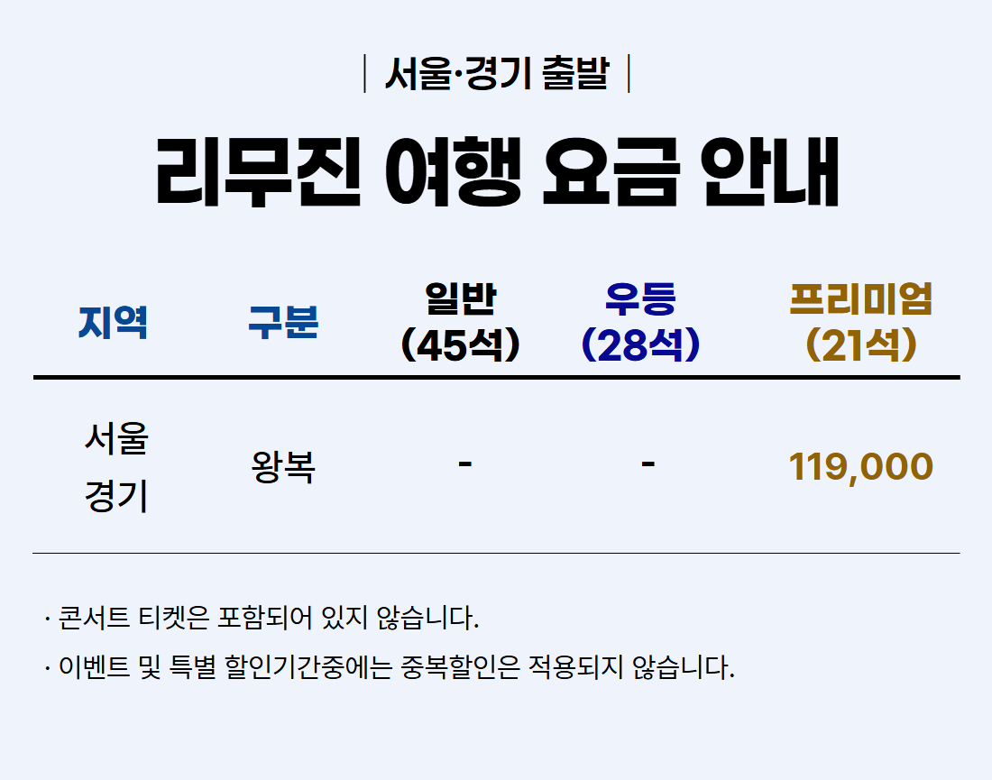 | ·불포함내역 | 콘서트 입장권, 개인 여행자 보험, 개인 비용 일체, 개별 식사, 개별 숙박, 가이드 미탑승, 쇼핑없음 |