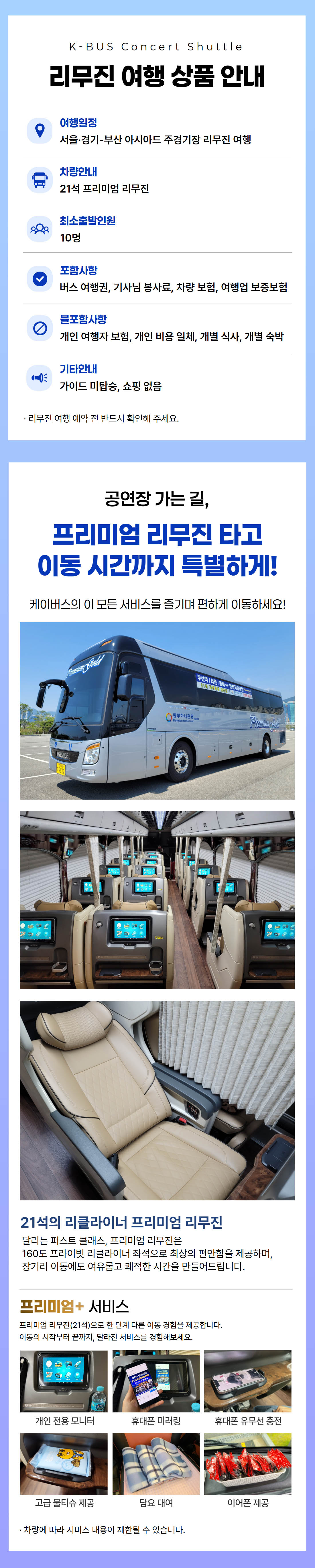 | ·포함내역 | 버스 여행권, 프리미엄 서비스 생수 (1병) 등, 차량 보험, 여행업 보증보험 |