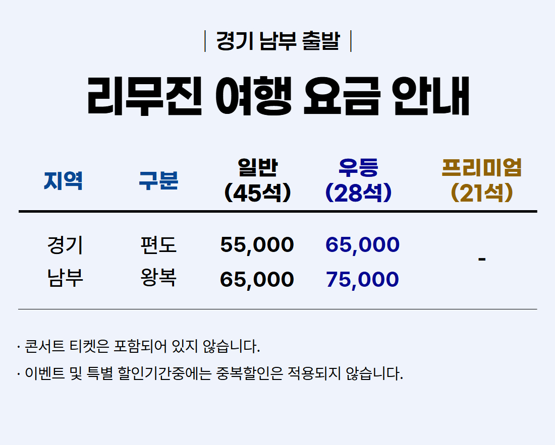 | ·불포함내역 | 콘서트 입장권, 개인 여행자 보험, 개인 비용 일체, 개별 식사, 개별 숙박, 가이드 미탑승, 쇼핑없음 |