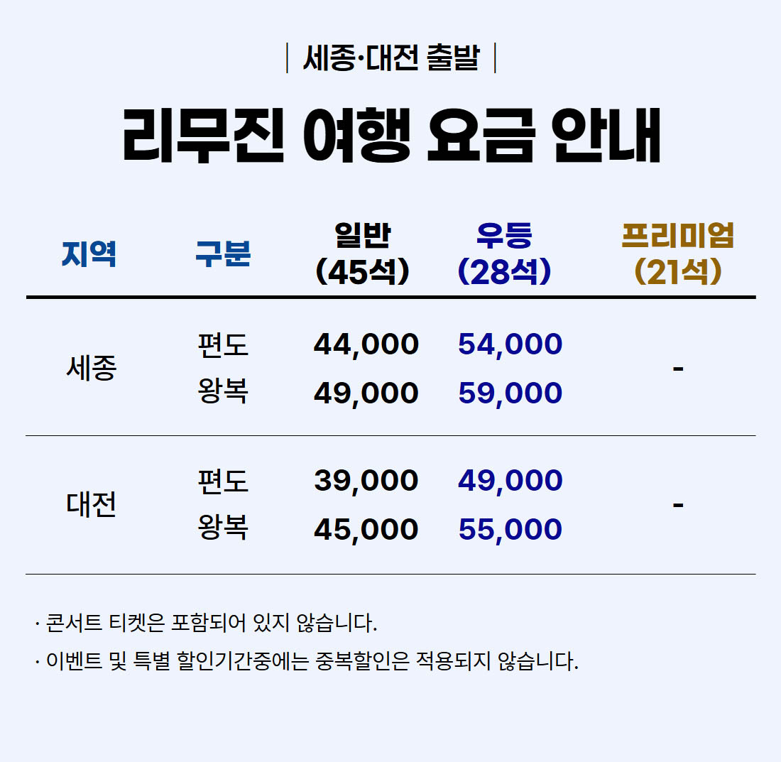 | ·불포함내역 | 콘서트 입장권, 개인 여행자 보험, 개인 비용 일체, 개별 식사, 개별 숙박, 가이드 미탑승, 쇼핑없음 |