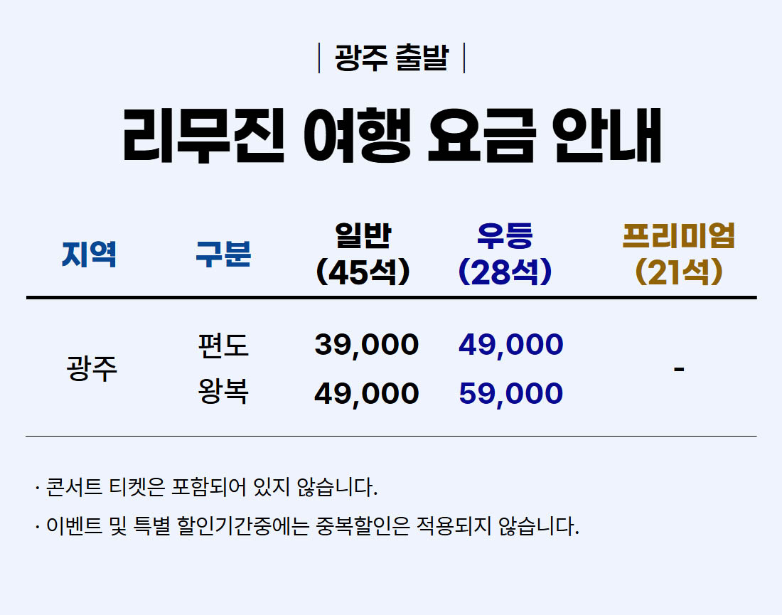 | ·불포함내역 | 콘서트 입장권, 개인 여행자 보험, 개인 비용 일체, 개별 식사, 개별 숙박, 가이드 미탑승, 쇼핑없음 |