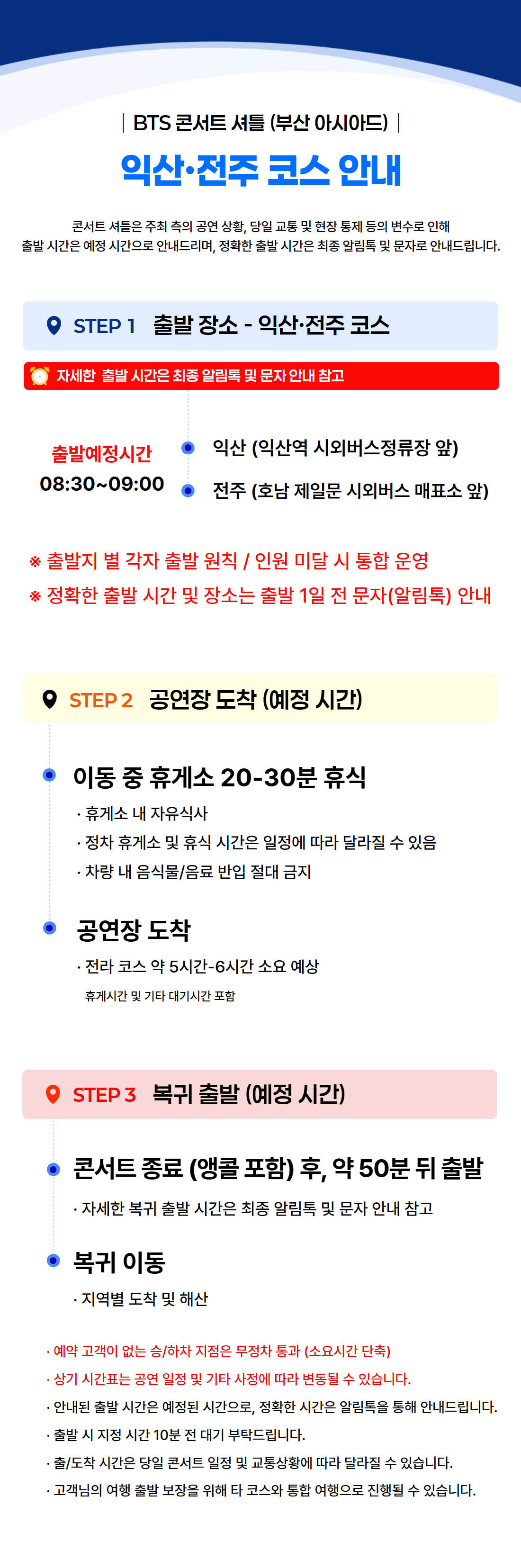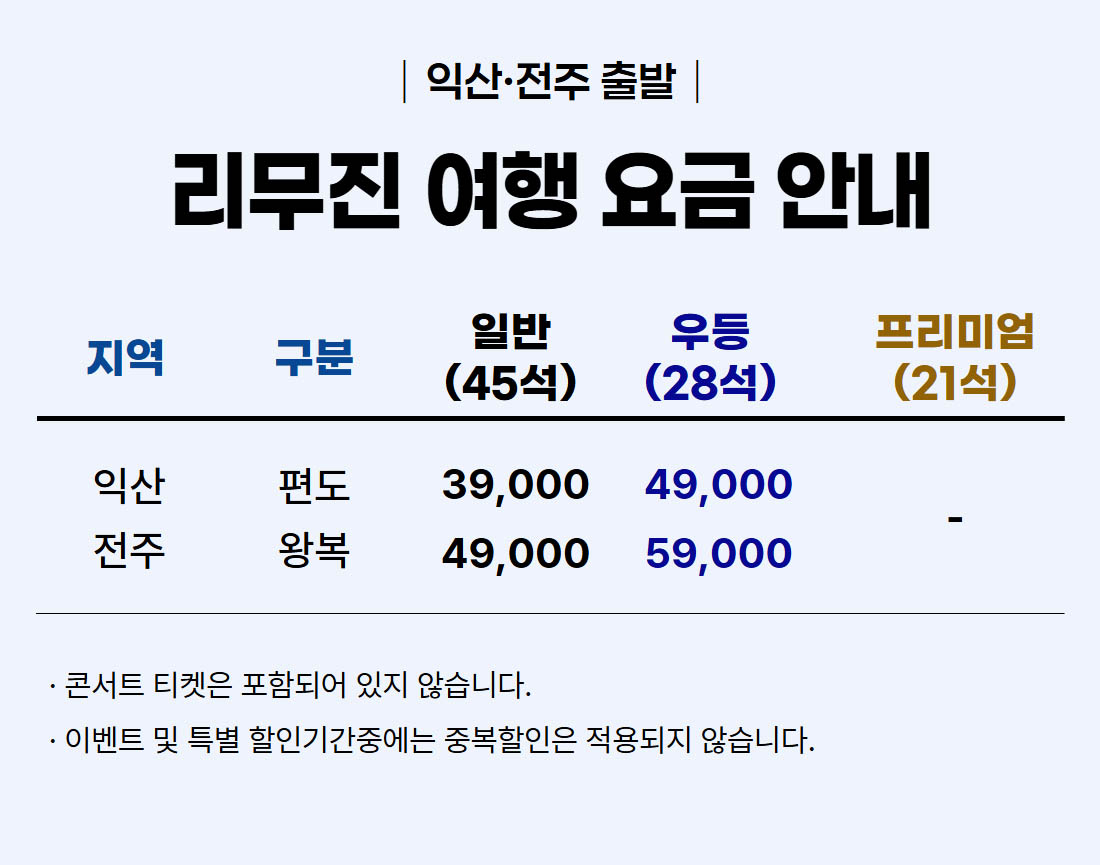 | ·불포함내역 | 콘서트 입장권, 개인 여행자 보험, 개인 비용 일체, 개별 식사, 개별 숙박, 가이드 미탑승, 쇼핑없음 |