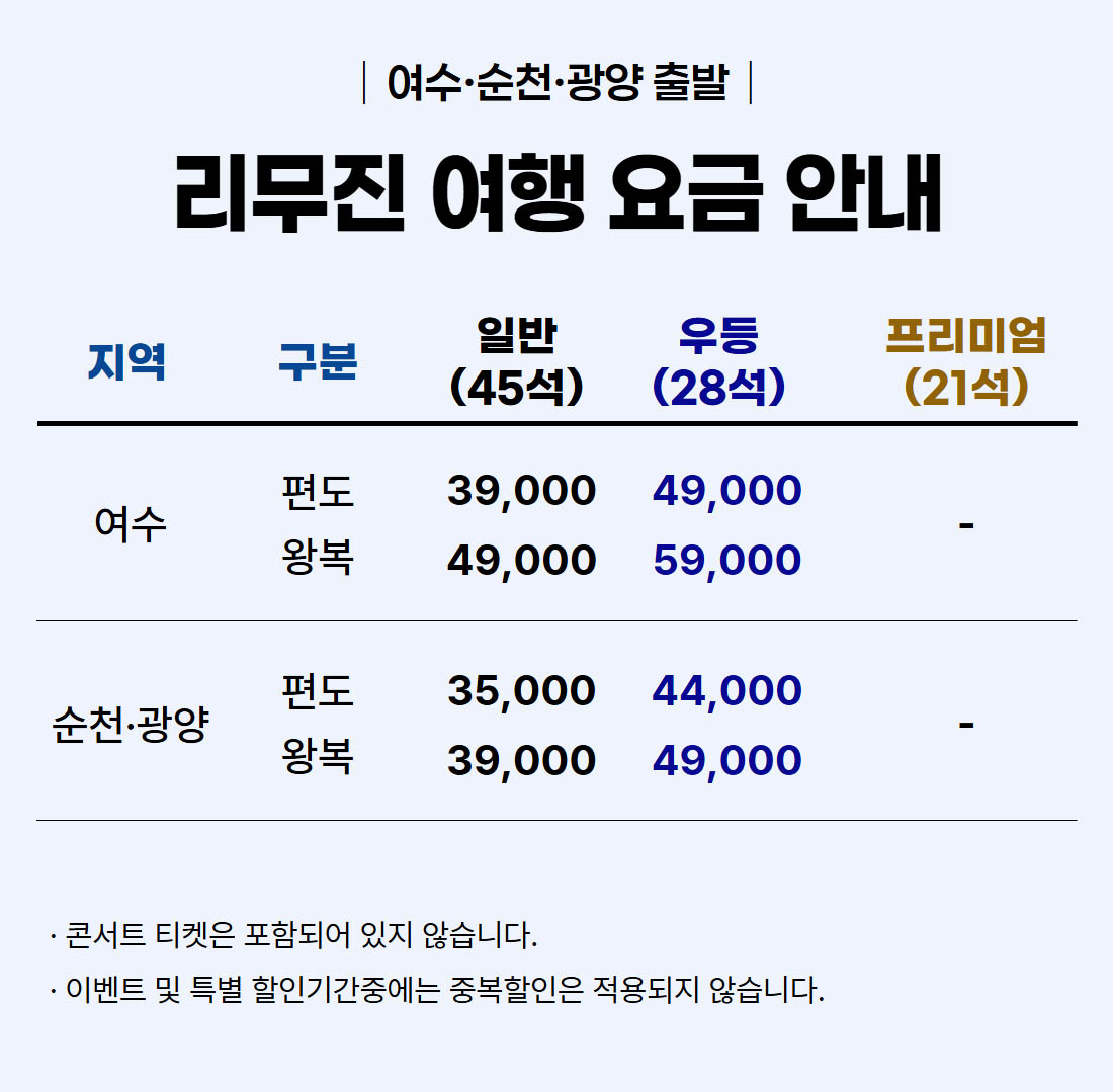 | ·불포함내역 | 콘서트 입장권, 개인 여행자 보험, 개인 비용 일체, 개별 식사, 개별 숙박, 가이드 미탑승, 쇼핑없음 |
