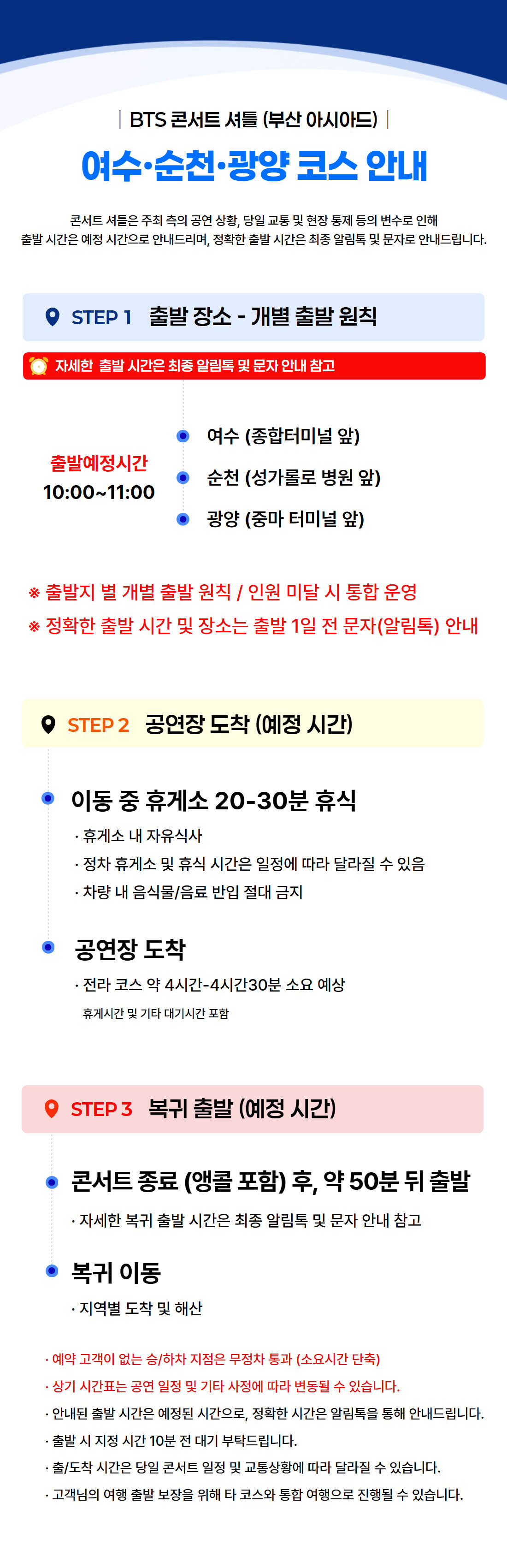 ※ 탑승시간 및 복귀시간을 철저히 준수 부탁드리며 시간 미준수로 인한 미탑승은 환불이 불가합니다.